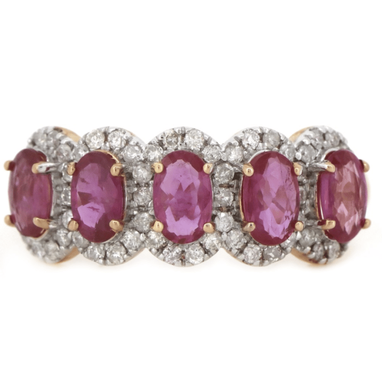 The Central Design Features, 5 Oval Cut, Medium Reddish-Pink, Sapphires (1.47Ct Tsw, Minor Eye Visible Inclusions), 4 Claw Set. Surrounding The Stones In Semi-Halos Are, 58 Round Brilliant Cut, Diamonds (0.29Ct Tdw, J-K Colour, Si2-I2 Clarity), Micro-Claw Set In White Gold. Ring Size M.