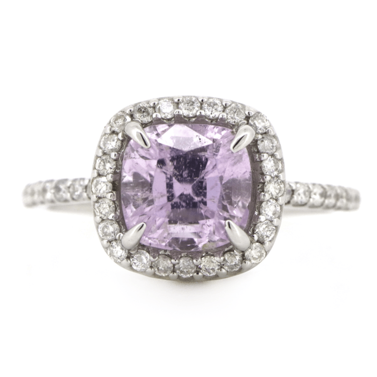 The Centre Features, One Square Cushion Cut, Medium Light Purplish-Pink, Kunzite (2.51Ct, Moderate Eye Visible Inclusions), Claw Set. Surrounding The Centre In A Halo And Decorating The Band Are, 42 Round Brilliant Cut, Diamonds (0.36Ct Tdw, J-K Colour, Si2-I2 Clarity), Micro-Claw Set. Ring Size M 3/4.