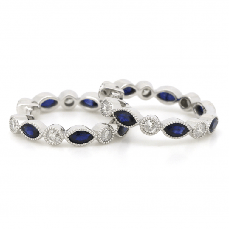 The Hoops Feature, 12 Marquise Cut, Royal Blue, Sapphires (1.97Ct Tsw, Included), Bezel Set With Millegrain Detail. Alternating With, 12 Round Brilliant Cut, Diamonds (0.77Ct Tdw, J-K Colour, Si2-I2 Clarity), Bezel Set With Millegrain Detail. The Earrings Have Hinged Snap Back Closures.