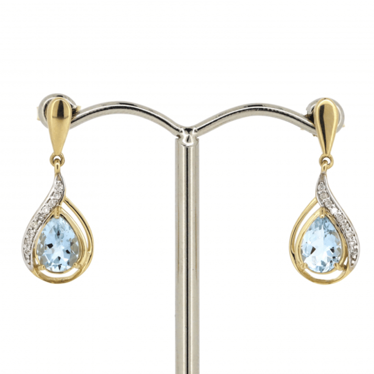 The Design Features, 2 Pear Cut, Medium Light Greyish-Blue, Aquamarines (1.15Ct Tsw, Minor Eye Visible Inclusions), Claw Set. Decorating The Design Are, 18 Round Brilliant Cut, Diamonds (0.07Ct Tdw, J-K Colour, Si2-I2 Clarity), Bead Set In White Gold. The Earrings Have Post Backs, With 14K Yellow Gold Butterfly Clasps.