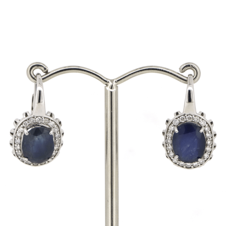 The Centres Feature, 2 Oval Faceted Cut, Deep Blue, Sapphires (4.52Ct Tsw, Included), 4 Claw Set. Surrounding The Centres In Halos Are, 20 Round Brilliant Cut, Light Champagne, Diamonds (0.40Ct Tdw, Si2-P2 Clarity), Bead Set. The Earrings Have Lever Back Closures.