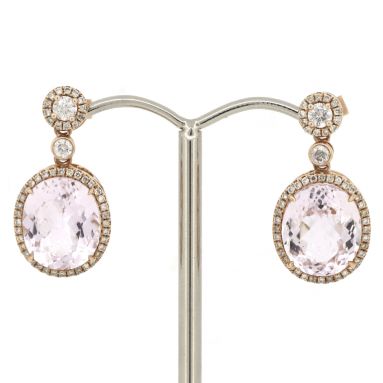 14K ROSE GOLD, KUNZITE AND DIAMOND, HALO DROP EARRINGS.
