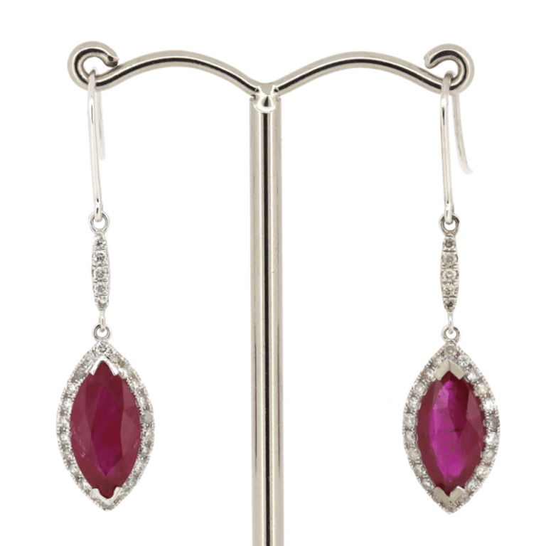 The Drops Feature, 2 Marquise Cut, Purplish-Red, Rubies (4.27Ct Tsw, Included), Claw Set. Surrounding The Stones In Halos And Decorating The Hooks Are, 54 Round Brilliant Cut, Diamonds (0.51Ct Tdw, H-I Colour, Si2-I2 Clarity), Micro-Claw Set. The Earrings Have Shepherd Hooks.