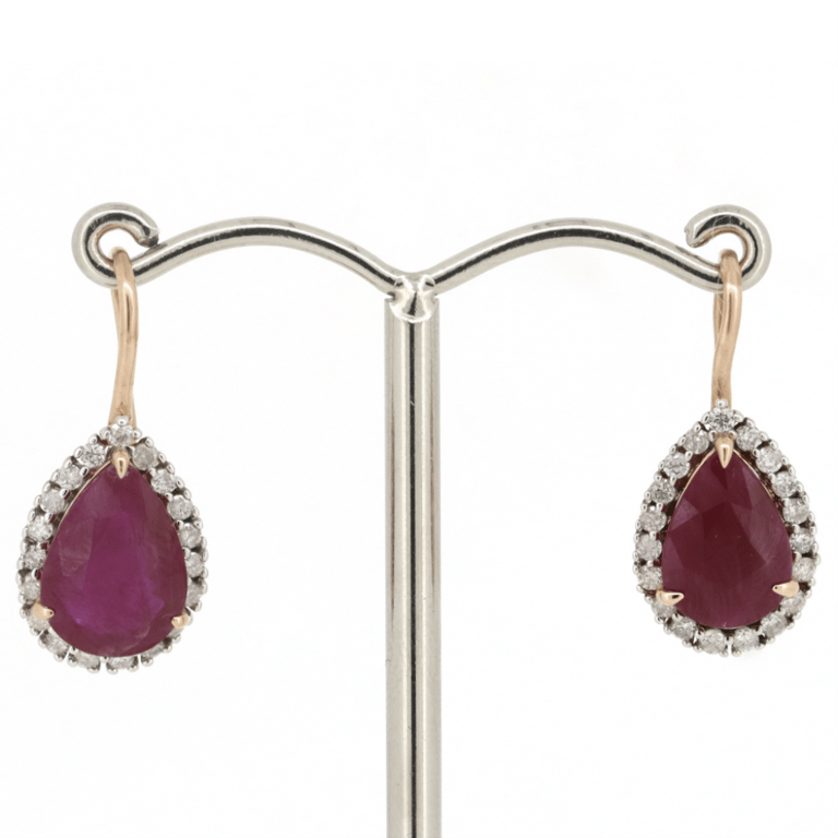The Centres Feature, 2 Pear Faceted Cut, Pinkish-Red, Rubies (4.04Ct Tsw, Included, Heat Enhanced), 3 Claw Set. Surrounding The Centres In Halos Are, 36 Round Brilliant Cut, Diamonds (0.48Ct Tdw, J-L Colour, P1-P2 Clarity), Claw Set. The Earrings Have Shepherd Hooks.