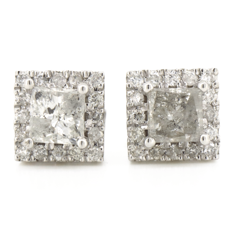 14K WHITE GOLD AND DIAMOND, HALO STUD EARRINGS. The Centres Feature, 2 Princess Cut, Diamonds (0.96Ct Tdw, H-J Colour, P2-P3 Clarity), Claw Set. Surrounding The Centres In Halos Are, 32 Round Brilliant Cut, Diamonds (0.19Ct Tdw, I-K Colour, P1-P3 Clarity), Claw Set. The Earrings Have Post Backs, With 14K White Gold Butterfly Clasps. Valuations Provided by an Independent Third-Party Professional Not Directly Associated With Lloyds Auctions at AUD $$14,500.00This valuation has been conducted by an independent third-party professional. The valuation amount is an assessment by the issuing valuer and does not reflect the auction value of the item. Any inquiries regarding the valuation should be directed to the issuing valuer (refer to contact details on the certificate), as Lloyds Auctions has no affiliation or influence over the valuation, the valuer, or the stated amount. Condition: Good - Refer Images 0645845+1532