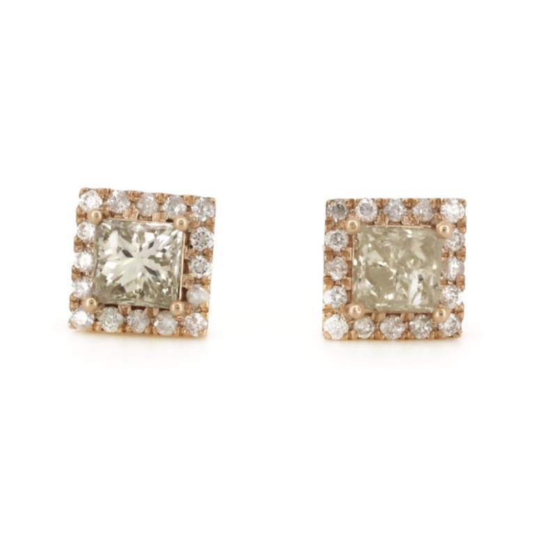 The Centres Feature, 2 Princess Cut, Light Champagne, Diamonds (1.29Ct Tdw, P1-P2 Clarity), 4 Claw Set. Surrounding The Centres In Halos Are, 32 Round Brilliant Cut, Diamonds (0.30Ct Tdw, J-L Colour, P1-P3 Clarity), Claw Set. The Earrings Have Post Backs, With 14K Rose Gold Butterfly Clasps.