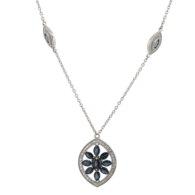 14K WHITE GOLD, BLUE SAPPHIRE AND DIAMOND, NECKLACE.