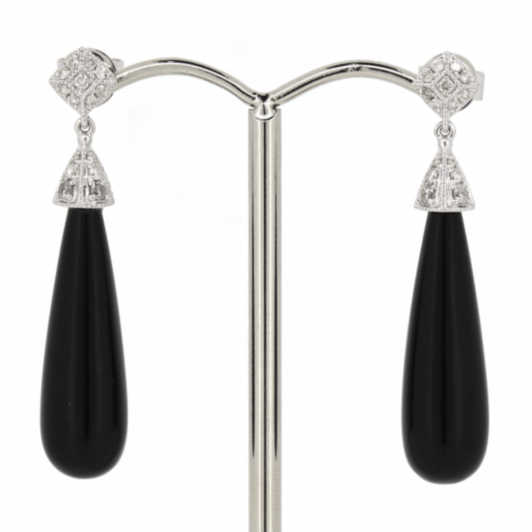 The Earrings Feature, 2 Tear Drop Cabochon Cut, Black, Onyx (27.0Mm X 8.0Mm Size, Opaque), Set As The Lower Drop. Decorating The Settings And Hooks Are, 42 Round Brilliant Cut, Diamonds (0.43Ct Tdw, J-K Colour, P1-P2 Clarity), Bead Set. The Earrings Have Post Backs, With 14K White Gold Butterfly Clasps.