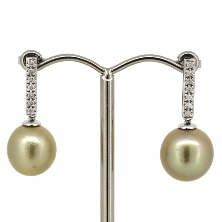 14K WHITE GOLD, GOLDEN CULTURED SOUTH SEA PEARL AND DIAMOND, VINTAGE INSPIRED DROP EARRINGS. The Drops Feature, 2 Near Round, Cream With Gold Overtones, Cultured South Sea Pearls (10.43Mm - 11.27Mm Size, Medium Lustre, Slightly Blemished), Post Set. Decorating The Joins Are, 14 Round Brilliant Cut, Diamonds (0.17Ct Tdw, J-K Colour, Si2-I2 Clarity), Bead Set. The Earrings Have Post Backs, With 14K White Gold Butterfly Clasps. Valuations Provided by an Independent Third-Party Professional Not Directly Associated With Lloyds Auctions at AUD $$6,890.00This valuation has been conducted by an independent third-party professional. The valuation amount is an assessment by the issuing valuer and does not reflect the auction value of the item. Any inquiries regarding the valuation should be directed to the issuing valuer (refer to contact details on the certificate), as Lloyds Auctions has no affiliation or influence over the valuation, the valuer, or the stated amount. Condition: Good - Refer Images 0645845+1558