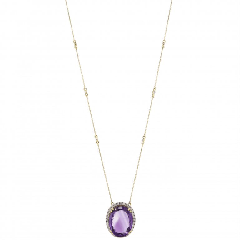 The Central Design Features, One Oval Cut, Medium Pinkish-Purple, Amethyst (18.38Ct, Minor Eye Visible Inclusions), Double Claw Set. Surrounding The Amethyst In A Halo And Decorating The Chain Are, 38 Round Brilliant Cut, Diamonds (0.85Ct Tdw, J-K Colour, Si2-I2 Clarity), Bead/Bezel Set In White Gold. The Necklace Has A Lobster Claw Clasp. Chain Length Is 54Cm.