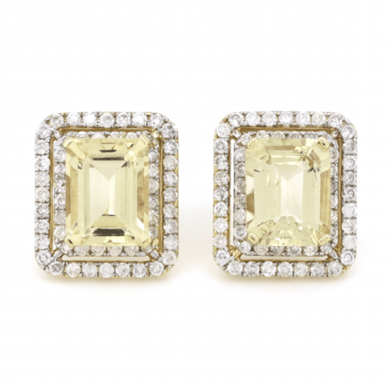 The Centres Feature, 2 Emerald Cut, Golden Yellow, Heliodors (3.68Ct Tsw, Eye Clean - Very Slightly Included), Claw Set. Surrounding The Centres In Double Halos Are, 110 Round Brilliant Cut, Diamonds (0.95Ct Tdw, J-L Colour, Si1-P2 Clarity), Claw Set. The Earrings Have Post Backs, With 14K Yellow Gold Butterfly Clasps.