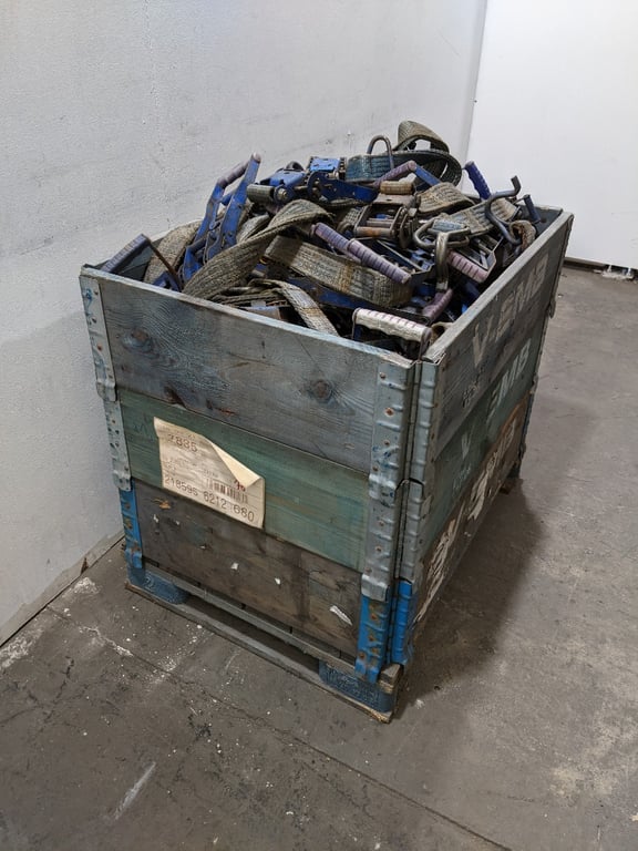 Bulk Lot of Heavy-Duty Ratchet Straps, Industrial Grade, Mix of blue & silver straps with metal ratcheting mechanisms, Includes hooks & fasteners, Used condition, Qty to create