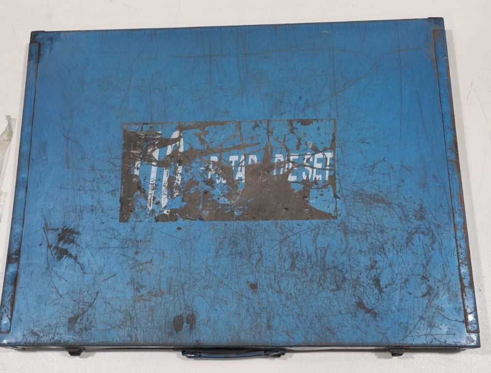Tap and die set for repairing screws, includes metal case. Dims: 60 x 5 x 47cm Note: Rust, wear and tear on case and some screws.