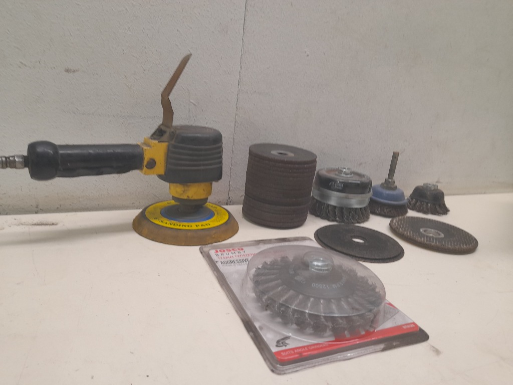 Sanding & Grinding Tool Assortment Includes: - 1 pneumatic orbital sander - 1 stack of sanding disks - 3 grinding/cutting wheels - 2 small wire cup brushes - 1 larger wire cup brush - 1 josco brumby, twistknot bevel brush 125mm Note: Item conditions may vary, cord for orbital sander not included Sold as lot