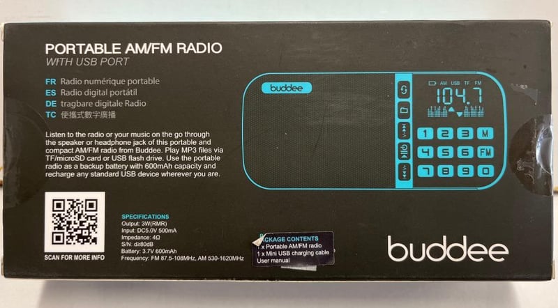 Buddee Rechargeable Digital Radio, MP3 Player (USB,SD), Powerbank, Speaker and Earphone Output, Charge Cable BRAND NEW IN BOX