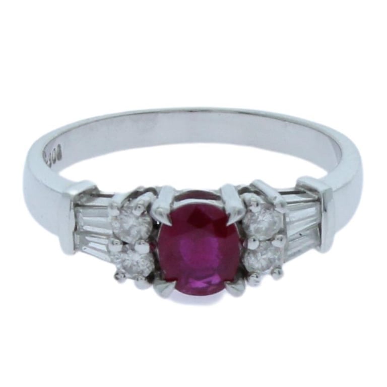 PLATINUM DRESS RING - Platinum Dress Ring, Narrow, Low Half Round, Tapered Shank With Open Back, 4 Claw Setting, Polished Finish, Stamped (Pt900). Ring Size Is M.. The Item Contains: One Claw Set Oval Shaped Natural Ruby, Colour Is "Medium, Strong, Purple Red". Dimensions = 5.42Mm(L) X 4.3Mm(W) X 2.36Mm(D-Estimated) Total Weight = 0.55Ct Eight Claw Set And End Set Natural Round Brilliant Cut And Taper Baguette Cut Diamonds, Clarity Is "Si1-I1", Colour Is "G-H". Dimensions = 2.3Mm(L) X 2.3Mm(W) X 1.4Mm(D-Estimated) (Smallest) Dimensions = 2.65Mm(L) X 1.5Mm(W) X 0.92Mm(D-Estimated) (Largest) Total Weight = 0.33Ct Estimated Item Totals: Total Item Weight = 4.58Gm Total Gemstone Weight = 0.88Ct Total Metal Weight = 4.40Gm Estimated Valuations Provided by an Independent Third-Party Professional Not Directly Associated With Lloyds Auctions at AUD $5956 This valuation has been conducted by an independent third-party professional. The valuation amount is an assessment by the issuing valuer and does not reflect the auction value of the item. Any inquiries regarding the valuation should be directed to the issuing valuer (refer to contact details on the certificate), as Lloyds Auctions has no affiliation or influence over the valuation, the valuer, or the stated amount. Condition: Good - Refer Images 0 160781+23