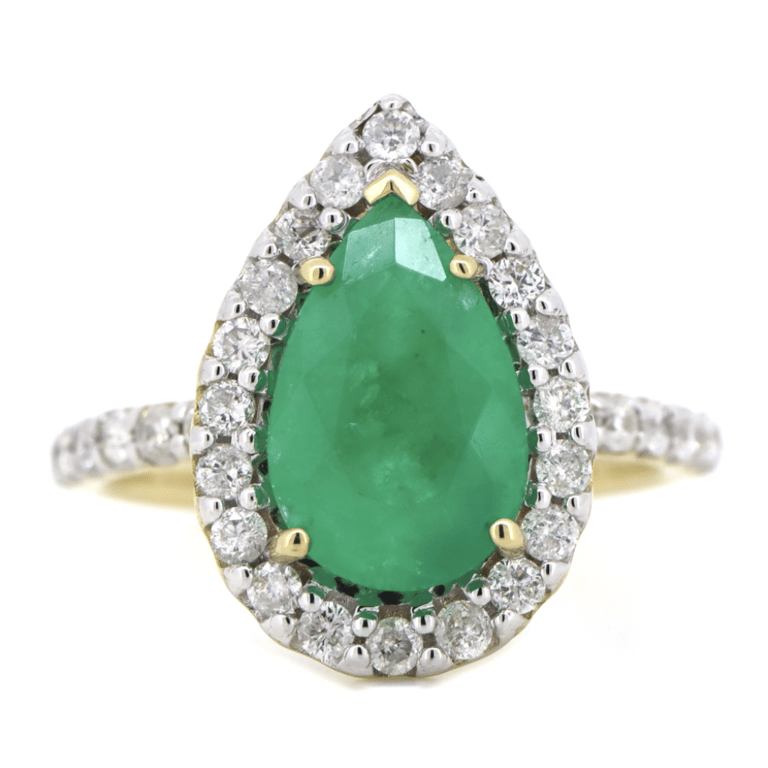 The Design Features, One Pear Cut, Medium Bluish-Green, Colombian Emerald (2.37Ct, Moderate Eye Visible Inclusions), Prong/Claw Set. Surrounding The Centre In A Halo And Decorating The Band Are, 34 Round Brilliant Cut, Diamonds (0.68Ct Tdw, J-K Colour, Si2-I2 Clarity), Micro-Claw Set In White Gold. Ring Size L 1/2.