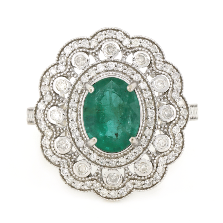 14K WHITE GOLD, EMERALD AND DIAMOND, CLUSTER RING. The Centre Features, One Oval Modified Brilliant Cut, Strong Deep Moderate Bluish-Green, Emerald (1.66Ct, Slightly Included), 4 Claw Set. Surrounding The Centre Are, 102 Round Brilliant Cut, Diamonds (0.73Ct Tdw, G-H Colour, Si1-Si2 Clarity), Bezel Set. Ring Size O 1/2. Valuations Provided by an Independent Third-Party Professional Not Directly Associated With Lloyds Auctions at AUD $$16,000.00This valuation has been conducted by an independent third-party professional. The valuation amount is an assessment by the issuing valuer and does not reflect the auction value of the item. Any inquiries regarding the valuation should be directed to the issuing valuer (refer to contact details on the certificate), as Lloyds Auctions has no affiliation or influence over the valuation, the valuer, or the stated amount. Condition: Good - Refer Images 0645835+248