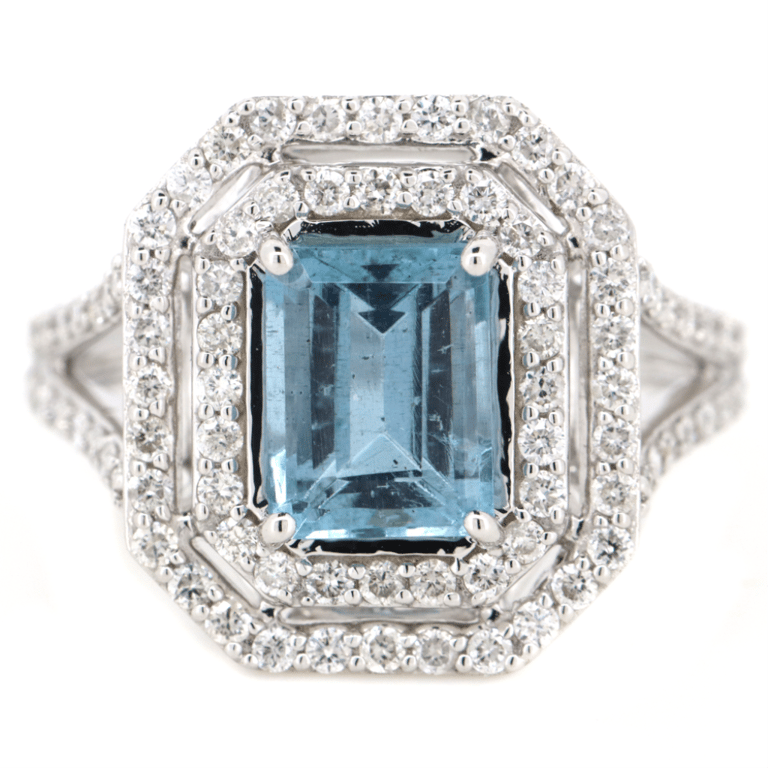 14K WHITE GOLD, AQUAMARINE AND DIAMOND, DOUBLE HALO RING. The Centre Features, One Emerald Cut, Aquamarine (1.78Ct, Slightly Included), Claw Set. Surrounding The Centre In A Double Halo And Decorating The Split Band Are, 84 Round Brilliant Cut, Diamonds (0.71Ct Tdw, G-H Colour, Si1-Si2 Clarity), Micro-Claw Set. Ring Size L 1/2. Valuations Provided by an Independent Third-Party Professional Not Directly Associated With Lloyds Auctions at AUD $$17,000.00This valuation has been conducted by an independent third-party professional. The valuation amount is an assessment by the issuing valuer and does not reflect the auction value of the item. Any inquiries regarding the valuation should be directed to the issuing valuer (refer to contact details on the certificate), as Lloyds Auctions has no affiliation or influence over the valuation, the valuer, or the stated amount. Condition: Good - Refer Images 0645835+289