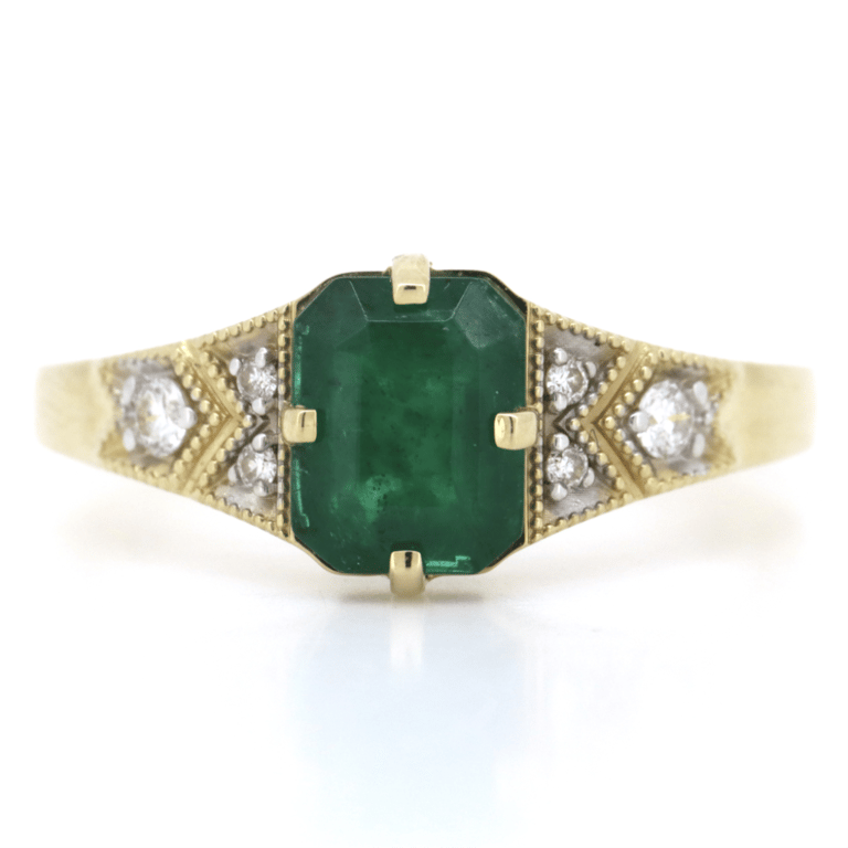 14K YELLOW GOLD, EMERALD AND DIAMOND, DRESS RING. The Centre Features, One Emerald Cut, Deep Green, Emerald (1.44Ct, Heavily Included), 4 Claw Set. Decorating The Band Are, 6 Round Brilliant Cut, Diamonds (0.10Ct Tdw, H-J Colour, Si-I2 Clarity), Micro-Pip Claw Set With Millegrain Detail. Ring Size P 1/2. Valuations Provided by an Independent Third-Party Professional Not Directly Associated With Lloyds Auctions at AUD $$11,700.00This valuation has been conducted by an independent third-party professional. The valuation amount is an assessment by the issuing valuer and does not reflect the auction value of the item. Any inquiries regarding the valuation should be directed to the issuing valuer (refer to contact details on the certificate), as Lloyds Auctions has no affiliation or influence over the valuation, the valuer, or the stated amount. Condition: Good - Refer Images 0645835+270
