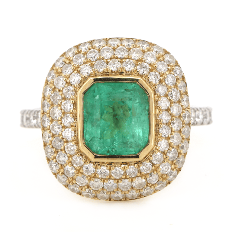 The Centre Features, One Emerald Cut, Bluish Green, Colombian Emerald (1.62Ct, Moderate Eye Visible Inclusions), Bezel Set In Yellow Gold. Surrounding The Centre In A Cluster Are, 100 Round Brilliant Cut, Diamonds (1.16Ct Tdw, J-K Colour, Si2-I2 Clarity), Micro-Claw Set In White/Yellow Gold. Ring Size M.
