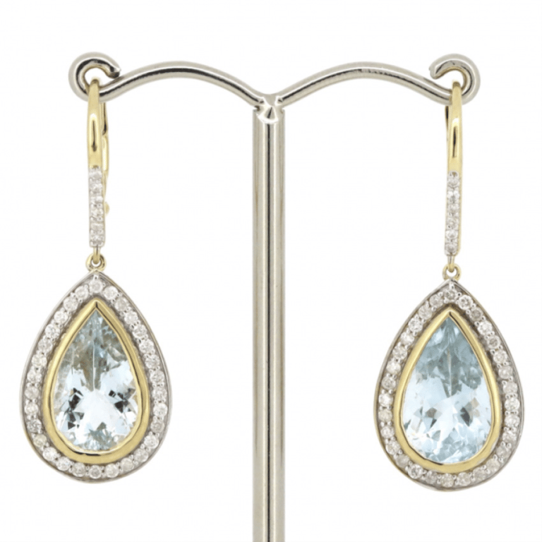 The Centres Feature, 2 Pear Cut, Light Greyish-Blue, Aquamarines (7.84Ct Tsw, Minor Eye Visible Inclusions), Bezel Set. Surrounding The Stones In Individual Halos And Decorating The Hooks Are, 72 Round Brilliant Cut, Diamonds (0.69Ct Tdw, J-K Colour, Si2-I2 Clarity), Bead Set In White Gold. The Earrings Feature Lever Back Closures.
