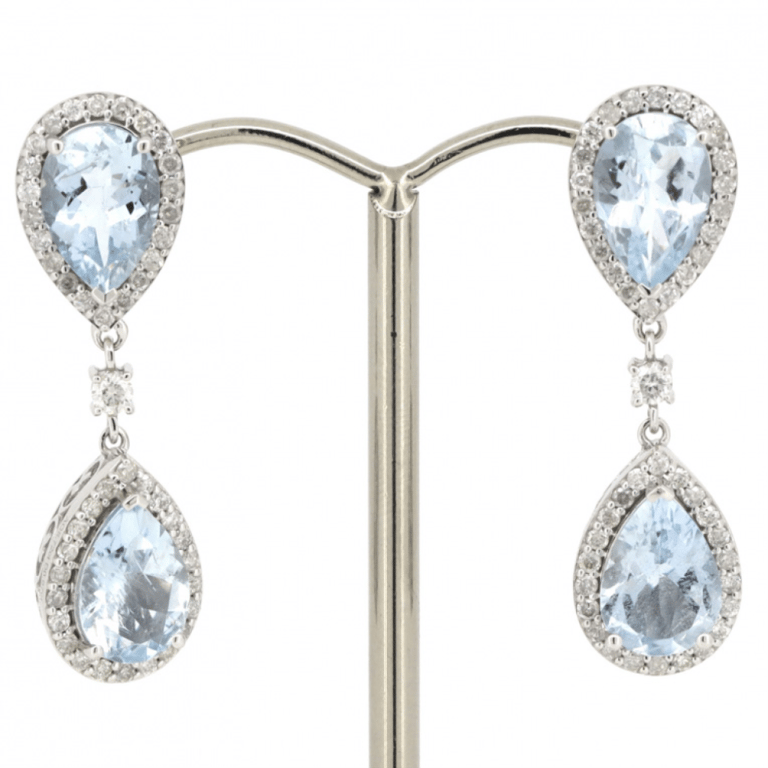 14K WHITE GOLD, AQUAMARINE AND DIAMOND, HALO DROP EARRINGS. The Design Features, 4 Pear Cut, Light Greyish-Blue, Aquamarines (5.72Ct Tsw, Minor Eye Visible Inclusions), V Prong/Claw Set. Surrounding The Stones In Halos And Decorating The Joins Are, 88 Round Brilliant Cut, Diamonds (0.97Ct Tdw, J-K Colour, Si2-I2 Clarity), Claw/Bead Set. The Earrings Have Post Backs, With, 14K White Gold Butterfly Clasps. Valuations Provided by an Independent Third-Party Professional Not Directly Associated With Lloyds Auctions at AUD $$11,890.00This valuation has been conducted by an independent third-party professional. The valuation amount is an assessment by the issuing valuer and does not reflect the auction value of the item. Any inquiries regarding the valuation should be directed to the issuing valuer (refer to contact details on the certificate), as Lloyds Auctions has no affiliation or influence over the valuation, the valuer, or the stated amount. Condition: Good - Refer Images 0645835+268