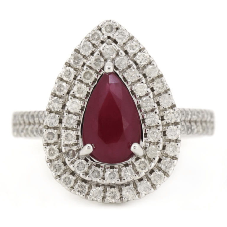 The Centre Features, One Pear Cut, Medium Dark Purplish-Red, Ruby (1.08Ct, Included), 3 Claw Set. Surrounding The Centre In A Double Halo And Decorating The Band Are, 84 Round Brilliant Cut, Diamonds (0.65Ct Tdw, J-K Colour, Si1-I1 Clarity), Micro-Claw Set. Ring Size M.