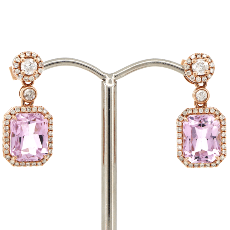 The Design Features, 2 Radiant Cut, Purplish-Pink, Kunzites (5.68Ct Tsw, Eye Clean Clarity To Minor Inclusions), Claw Set. Decorating The Drops And Surrounding The Centres In Halos Are, 90 Round Brilliant Cut, Diamonds (0.71Ct Tdw, I-K Colour, P1-P3 Clarity), Claw/Bezel Set. The Earrings Have Post Backs With 14K Rose Gold Butterfly Clasps.