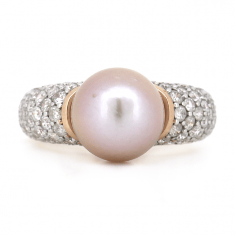 The Centre Features, One Round Brilliant Cut, Pinkish-Purple, Cultured South Sea Pearl (9.50Mm-10.00Mm Size, Excellent Lustre, Enhanced). Decorating The Band Are, 84 Round Brilliant Cut, Diamonds (1.34Ct Tdw, H-K Colour, P2-P3 Clarity), Bead Set. Ring Size O 1/2.