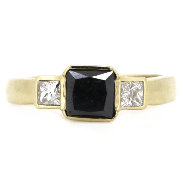 The Centre Features, One Princess Cut, Black, Diamond (1.25Ct, Opaque), Bezel Set. Flanked By, 2 Princess Cut, Diamonds (0.26Ct Tdw, H-I Colour, Si-I1 Clarity), Bezel Set. Ring Size N.