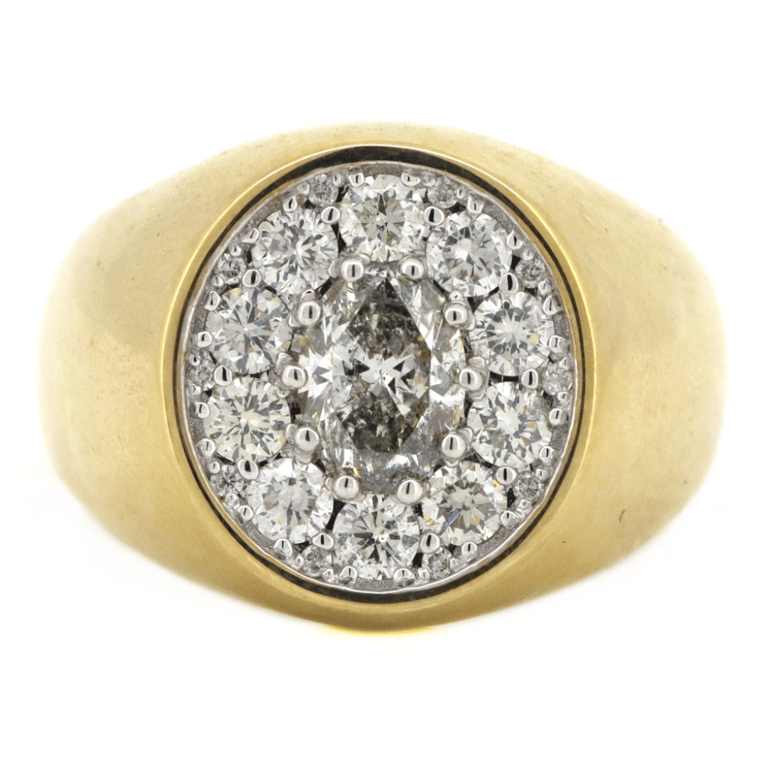 14K YELLOW GOLD AND DIAMOND, GENTS RING. The Centre Features, One Oval Brilliant Cut, Diamond (1.02Ct, H-I Colour, Si1-P1 Clarity), 10-Claw Set. Encompassing The Design Are, 20 Round Brilliant Cut, Diamonds (0.92Ct Tdw, H-I Colour, Si1-Si2 Clarity), Micro-Bead Set. Ring Size U 1/2. Valuations Provided by an Independent Third-Party Professional Not Directly Associated With Lloyds Auctions at AUD $$24,000.00This valuation has been conducted by an independent third-party professional. The valuation amount is an assessment by the issuing valuer and does not reflect the auction value of the item. Any inquiries regarding the valuation should be directed to the issuing valuer (refer to contact details on the certificate), as Lloyds Auctions has no affiliation or influence over the valuation, the valuer, or the stated amount. Condition: Good - Refer Images 0645841+388