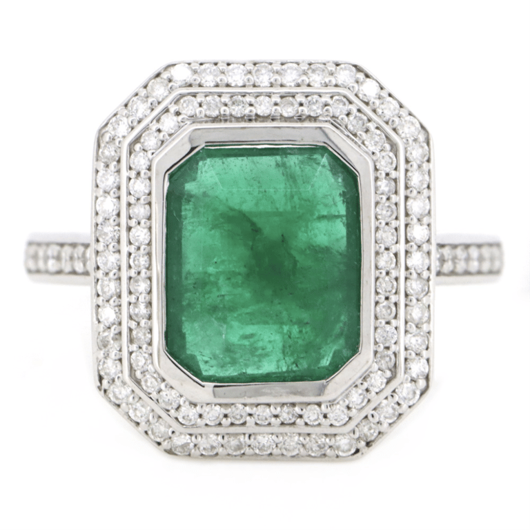 14K WHITE GOLD, EMERALD AND DIAMOND, DOUBLE HALO RING. The Centre Features, One Emerald Cut, Medium-Dark Green, Emerald (2.54Ct, Moderate-Heavy Inclusions), Bezel Set. Surrounding The Centre And Decorating The Band Are, 96 Round Brilliant Cut, Diamonds (0.46Ct, G-H Colour, Si Clarity), Bead Set. Ring Size Q. Valuations Provided by an Independent Third-Party Professional Not Directly Associated With Lloyds Auctions at AUD $$22,800.00This valuation has been conducted by an independent third-party professional. The valuation amount is an assessment by the issuing valuer and does not reflect the auction value of the item. Any inquiries regarding the valuation should be directed to the issuing valuer (refer to contact details on the certificate), as Lloyds Auctions has no affiliation or influence over the valuation, the valuer, or the stated amount. Condition: Good - Refer Images 0645841+339