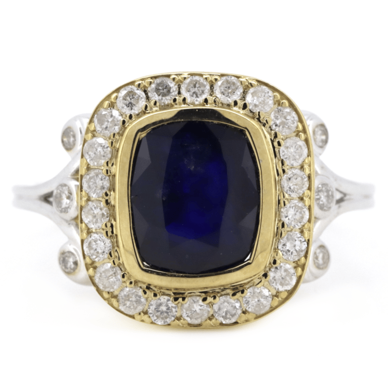 14K YELLOW/WHITE GOLD, 2.64CT BLUE CEYLON SAPPHIRE AND DIAMOND, DRESS RING. The Centre Features, One Cushion Cut, Medium Dark Blue, Ceylon Sapphire (2.64Ct, Included), Bezel Set In Yellow Gold. Surrounding The Centre And Decorating The Shoulders Are, 28 Round Brilliant Cut, Diamonds (0.44Ct Tdw, J-K Colour, Si2-I2 Clarity), Bezel/Bead Set In White/Yellow Gold. Ring Size N. Valuations Provided by an Independent Third-Party Professional Not Directly Associated With Lloyds Auctions at AUD $$10,590.00This valuation has been conducted by an independent third-party professional. The valuation amount is an assessment by the issuing valuer and does not reflect the auction value of the item. Any inquiries regarding the valuation should be directed to the issuing valuer (refer to contact details on the certificate), as Lloyds Auctions has no affiliation or influence over the valuation, the valuer, or the stated amount. Condition: Good - Refer Images 0645841+398