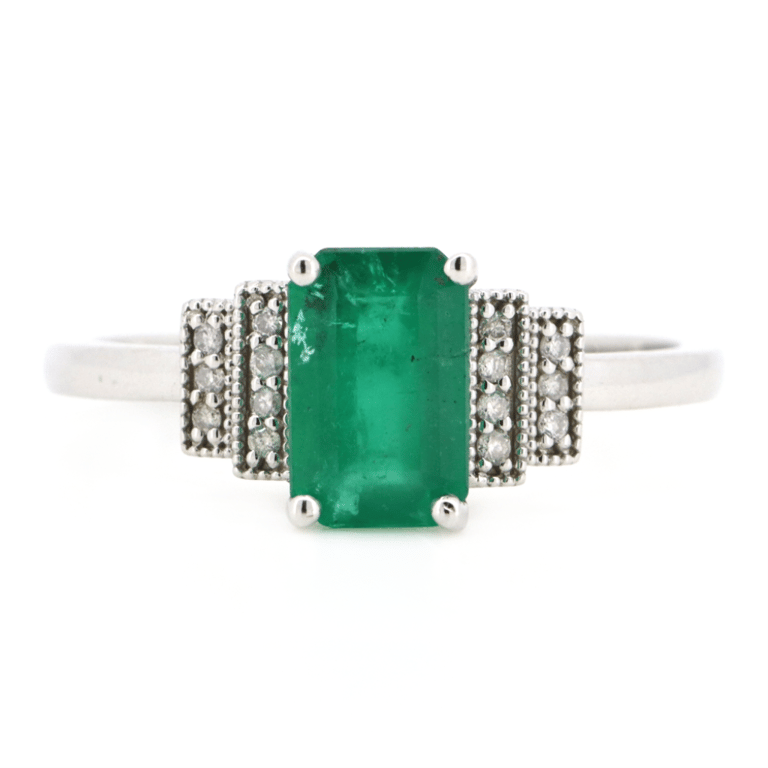 14K WHITE GOLD, EMERALD AND DIAMOND, DRESS RING. The Centre Features, One Emerald Cut, Medium Bluish-Green, Emerald (1.63Ct, Moderate Eye Visible Inclusions), 4 Claw Set. Flanked By, 14 Round Brilliant Cut, Diamonds (0.08Ct Tdw, J-K Colour, Si2-I2 Clarity), Bead Set With Millegrain Detail. Ring Size T. Valuations Provided by an Independent Third-Party Professional Not Directly Associated With Lloyds Auctions at AUD $$8,190.00This valuation has been conducted by an independent third-party professional. The valuation amount is an assessment by the issuing valuer and does not reflect the auction value of the item. Any inquiries regarding the valuation should be directed to the issuing valuer (refer to contact details on the certificate), as Lloyds Auctions has no affiliation or influence over the valuation, the valuer, or the stated amount. Condition: Good - Refer Images 0645841+309