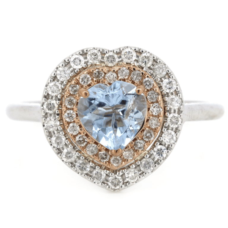 14K WHITE/ROSE GOLD, AQUAMARINE AND DIAMOND, DOUBLE HALO RING. The Centre Features, One Heart Faceted Cut, Light Blue, Aquamarine (0.65Ct, Moderate Natural Inclusions), 3 Claw Set In Rose Gold. Decorating The Innermost Halo Are, 20 Round Brilliant Cut, Diamonds (0.10Ct Tdw, H-J Colour, Si-I1 Clarity), Bead Set In Rose Gold. Decorating The Outermost Halo Are, 22 Round Brilliant Cut, Diamonds (0.22Ct Tdw, H-J Colour, Si-I1 Clarity), Bead Set. Ring Size M. Valuations Provided by an Independent Third-Party Professional Not Directly Associated With Lloyds Auctions at AUD $$9,500.00This valuation has been conducted by an independent third-party professional. The valuation amount is an assessment by the issuing valuer and does not reflect the auction value of the item. Any inquiries regarding the valuation should be directed to the issuing valuer (refer to contact details on the certificate), as Lloyds Auctions has no affiliation or influence over the valuation, the valuer, or the stated amount. Condition: Good - Refer Images 0645841+313