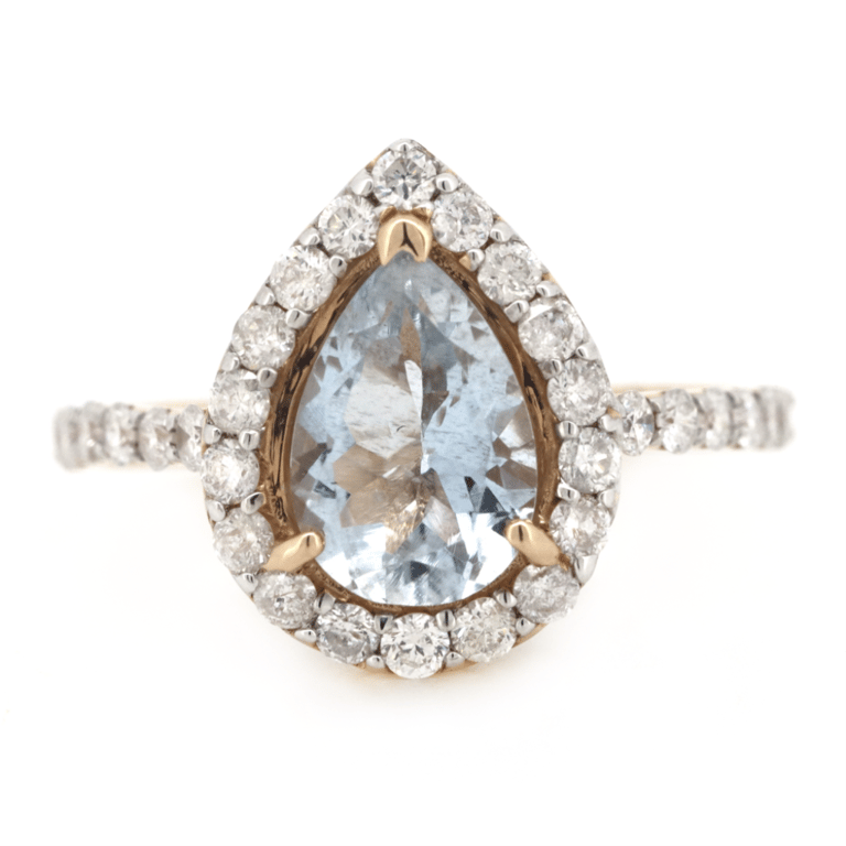 14K ROSE GOLD, AQUAMARINE AND DIAMOND, HALO RING. The Centre Features, One Pear Cut, Light Greyish-Blue, Aquamarine (1.04Ct, Minor Eye Visible Inclusions), 3 Claw Set. Surrounding The Centre In A Halo And Decorating The Band Are, 30 Round Brilliant Cut, Diamonds (0.55Ct Tdw, J-K Colour, Si2-I2 Clarity), Bead Set. Ring Size K. Valuations Provided by an Independent Third-Party Professional Not Directly Associated With Lloyds Auctions at AUD $$6,190.00This valuation has been conducted by an independent third-party professional. The valuation amount is an assessment by the issuing valuer and does not reflect the auction value of the item. Any inquiries regarding the valuation should be directed to the issuing valuer (refer to contact details on the certificate), as Lloyds Auctions has no affiliation or influence over the valuation, the valuer, or the stated amount. Condition: Good - Refer Images 0645841+331