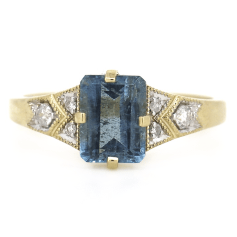 14K YELLOW GOLD, AQUAMARINE AND DIAMOND, DRESS RING. The Centre Features, One Emerald Cut, Santa Maria Blue, Aquamarine (1.76Ct, Slightly-Moderately Included), 4 Claw Set. Decorating The Band Are, 6 Round Brilliant Cut, Diamonds (0.10Ct Tdw, G-H Colour, Si2-P1 Clarity), Micro-Pip Claw Set With Millegrain Detail. Ring Size O. Valuations Provided by an Independent Third-Party Professional Not Directly Associated With Lloyds Auctions at AUD $$9,000.00This valuation has been conducted by an independent third-party professional. The valuation amount is an assessment by the issuing valuer and does not reflect the auction value of the item. Any inquiries regarding the valuation should be directed to the issuing valuer (refer to contact details on the certificate), as Lloyds Auctions has no affiliation or influence over the valuation, the valuer, or the stated amount. Condition: Good - Refer Images 0645841+372