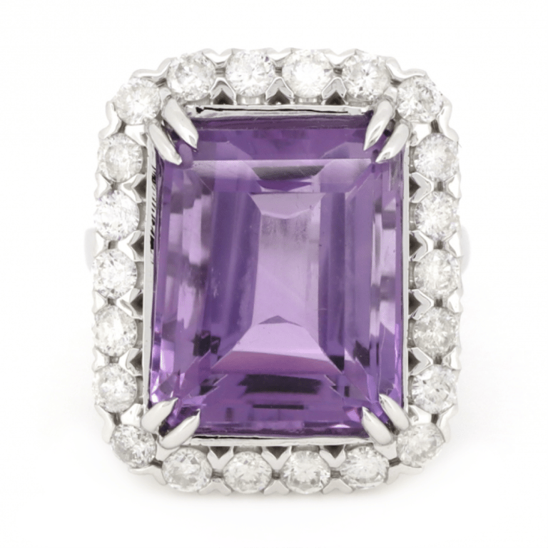 14K WHITE GOLD, 14.34CT AMETHYST AND DIAMOND, STATEMENT RING. The Centre Features, One Emerald Cut, Reddish-Purple, Amethyst (14.34Ct, Minor Eye Visible Inclusions), Double 4 Claw Set. Surrounding The Centre In A Halo Are, 18 Round Brilliant Cut, Diamonds (1.58Ct Tdw, J-K Colour, Si2-I2 Clarity), Semi-Bezel Set. Ring Size O. Valuations Provided by an Independent Third-Party Professional Not Directly Associated With Lloyds Auctions at AUD $$8,490.00This valuation has been conducted by an independent third-party professional. The valuation amount is an assessment by the issuing valuer and does not reflect the auction value of the item. Any inquiries regarding the valuation should be directed to the issuing valuer (refer to contact details on the certificate), as Lloyds Auctions has no affiliation or influence over the valuation, the valuer, or the stated amount. Condition: Good - Refer Images 0645841+333