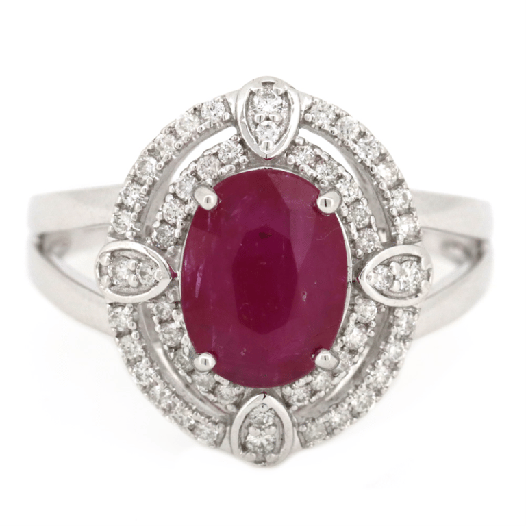 14K WHITE GOLD, RUBY AND DIAMOND, DOUBLE HALO RING. The Centre Features, One Oval Cut, Ruby (2.08Ct, Moderate Inclusions), 4 Claw Set. Encompassing The Design Are, 52 Round Brilliant Cut, Diamonds (0.28Ct Tdw, G-H Colour, Si1-Si2 Clarity), Micro-Bead Set. Ring Size N 1/2. Valuations Provided by an Independent Third-Party Professional Not Directly Associated With Lloyds Auctions at AUD $$20,000.00This valuation has been conducted by an independent third-party professional. The valuation amount is an assessment by the issuing valuer and does not reflect the auction value of the item. Any inquiries regarding the valuation should be directed to the issuing valuer (refer to contact details on the certificate), as Lloyds Auctions has no affiliation or influence over the valuation, the valuer, or the stated amount. Condition: Good - Refer Images 0645841+389
