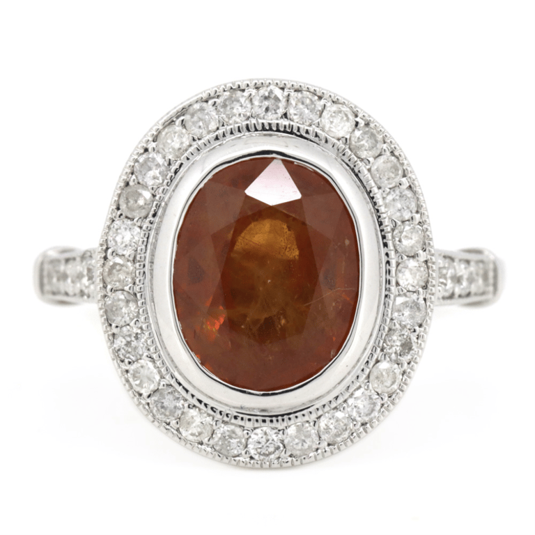 14K WHITE GOLD, ORANGE SAPPHIRE AND DIAMOND, HALO RING. The Centre Features, One Oval Cut, Yellowish-Orange, Sapphire (3.41Ct, Moderate Eye Visible Inclusions), Bezel Set. Surrounding The Centre In A Halo And Decorating The Shoulders Are, 34 Round Brilliant Cut, Diamonds (0.48Ct Tdw, J-K Colour, Si2-I2 Clarity), Bead Set With Millegrain Detail. Ring Size O 1/2. Valuations Provided by an Independent Third-Party Professional Not Directly Associated With Lloyds Auctions at AUD $$13,690.00This valuation has been conducted by an independent third-party professional. The valuation amount is an assessment by the issuing valuer and does not reflect the auction value of the item. Any inquiries regarding the valuation should be directed to the issuing valuer (refer to contact details on the certificate), as Lloyds Auctions has no affiliation or influence over the valuation, the valuer, or the stated amount. Condition: Good - Refer Images 0645841+365