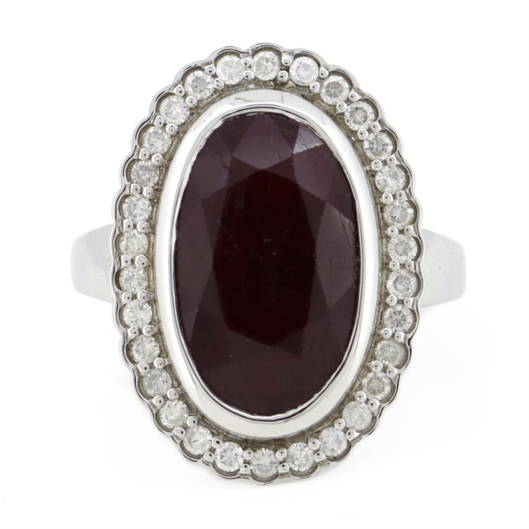 14K WHITE GOLD, 7.47CT RUBY AND DIAMOND, COCKTAIL RING. The Centre Features, One Oval Faceted Cut, Deep Red, Ruby (7.47Ct, Included, Heat Enhanced), Bezel Set. Surrounding The Centre In A Halo Are, 31 Round Brilliant Cut, Diamonds (0.40Ct Tdw, I-K Colour, Si2-P1 Clarity), Bead Set. Ring Size O. Valuations Provided by an Independent Third-Party Professional Not Directly Associated With Lloyds Auctions at AUD $$10,480.00This valuation has been conducted by an independent third-party professional. The valuation amount is an assessment by the issuing valuer and does not reflect the auction value of the item. Any inquiries regarding the valuation should be directed to the issuing valuer (refer to contact details on the certificate), as Lloyds Auctions has no affiliation or influence over the valuation, the valuer, or the stated amount. Condition: Good - Refer Images 0645841+386