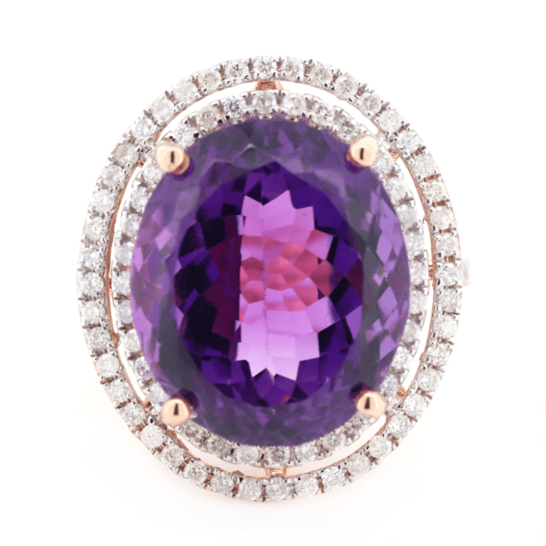 14K ROSE GOLD, 17.95CT AMETHYST AND DIAMOND, STATEMENT RING. The Centre Features, One Oval Cut, Medium-Deep Purple, Amethyst (17.95Ct, Eye Clean Clarity), 4 Claw Set. Surrounding The Centre In A Halo And Decorating The Band Are, 88 Round Brilliant Cut, Diamonds (0.73Ct Tdw, I-K Colour, Si2-P2 Clarity), Claw Set. Ring Size N. Valuations Provided by an Independent Third-Party Professional Not Directly Associated With Lloyds Auctions at AUD $$10,750.00This valuation has been conducted by an independent third-party professional. The valuation amount is an assessment by the issuing valuer and does not reflect the auction value of the item. Any inquiries regarding the valuation should be directed to the issuing valuer (refer to contact details on the certificate), as Lloyds Auctions has no affiliation or influence over the valuation, the valuer, or the stated amount. Condition: Good - Refer Images 0645841+350