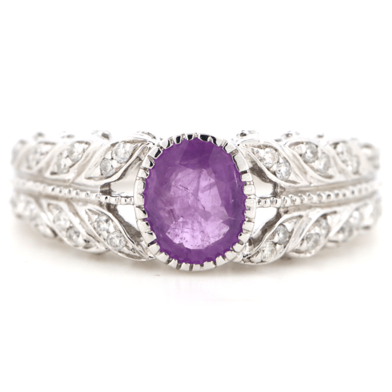 14K WHITE GOLD, PINK SAPPHIRE AND DIAMOND, ART DECO INSPIRED RING. The Centre Design Features, One Oval Faceted Cut, Purplish Pink, Sapphire (1.08Ct, Slightly Included), Bezel Set. Encompassing The Design Are, 40 Round Brilliant Cut, Diamonds (0.21Ct Tdw, J-K Colour, Si2-I2 Clarity), Bead Set. Ring Size O. Valuations Provided by an Independent Third-Party Professional Not Directly Associated With Lloyds Auctions at AUD $$6,490.00This valuation has been conducted by an independent third-party professional. The valuation amount is an assessment by the issuing valuer and does not reflect the auction value of the item. Any inquiries regarding the valuation should be directed to the issuing valuer (refer to contact details on the certificate), as Lloyds Auctions has no affiliation or influence over the valuation, the valuer, or the stated amount. Condition: Good - Refer Images 0645841+394