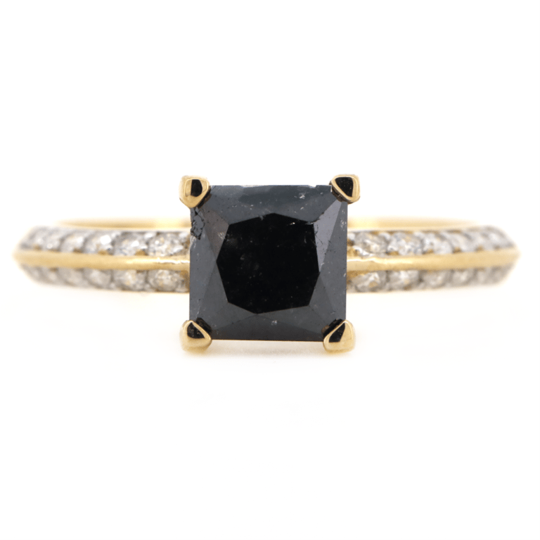 14K YELLOW GOLD, BLACK DIAMOND AND DIAMOND, CLASSIC RING. The Centre Features, One Square Princess Cut, Black, Diamond (1.41Ct, Opaque Clarity), 4 Claw Set. Decorating The Band Are, 24 Round Brilliant Cut, Diamonds (0.23Ct Tdw, G-H Colour, Si1-Si2 Clarity), Bead Set. Ring Size M 1/2. Valuations Provided by an Independent Third-Party Professional Not Directly Associated With Lloyds Auctions at AUD $$7,000.00This valuation has been conducted by an independent third-party professional. The valuation amount is an assessment by the issuing valuer and does not reflect the auction value of the item. Any inquiries regarding the valuation should be directed to the issuing valuer (refer to contact details on the certificate), as Lloyds Auctions has no affiliation or influence over the valuation, the valuer, or the stated amount. Condition: Good - Refer Images 0645841+342