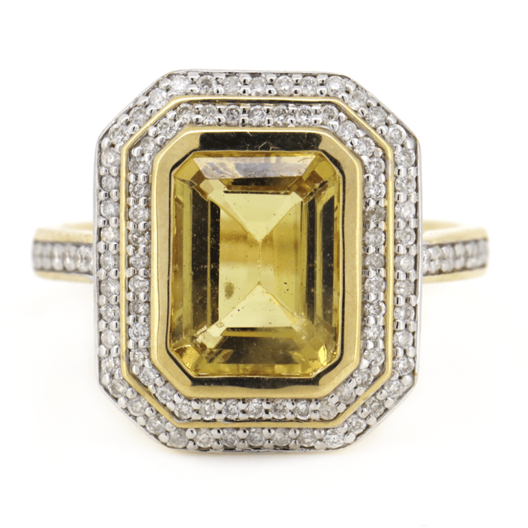 14K YELLOW GOLD, HELIODOR AND DIAMOND, DOUBLE HALO RING. The Centre Features, One Emerald Cut, Heliodor (2.63Ct, Minor Eye Visible Inclusions), Bezel Set. Surrounding The Centre In A Double Halo And Decorating The Band Are, 96 Round Brilliant Cut, Diamonds (0.43Ct Tdw, H-K Colour, Si1-Si2 Clarity), Bead Set. Ring Size P 1/2. Valuations Provided by an Independent Third-Party Professional Not Directly Associated With Lloyds Auctions at AUD $$10,000.00This valuation has been conducted by an independent third-party professional. The valuation amount is an assessment by the issuing valuer and does not reflect the auction value of the item. Any inquiries regarding the valuation should be directed to the issuing valuer (refer to contact details on the certificate), as Lloyds Auctions has no affiliation or influence over the valuation, the valuer, or the stated amount. Condition: Good - Refer Images 0645841+358
