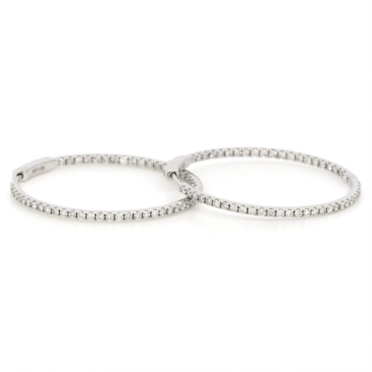 14K WHITE GOLD, 1.42CT TDW DIAMOND, HOOP EARRINGS. The Hoops Feature, 98 Round Brilliant Cut, Diamonds (1.42Ct Tdw, H-K Colour, P1 Clarity), Pip-Claw Set. The Earrings Have 14K White Gold Hinged Snap Closures. Valuations Provided by an Independent Third-Party Professional Not Directly Associated With Lloyds Auctions at AUD $$7,500.00This valuation has been conducted by an independent third-party professional. The valuation amount is an assessment by the issuing valuer and does not reflect the auction value of the item. Any inquiries regarding the valuation should be directed to the issuing valuer (refer to contact details on the certificate), as Lloyds Auctions has no affiliation or influence over the valuation, the valuer, or the stated amount. Condition: Good - Refer Images 0645841+348