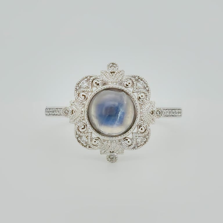14CT WHITE GOLD MOONSTONE AND DIAMOND HALO RING. Featuring Centre, One Round Cabochon Cut, Light Blue Moonstone (1.16Ct, Slightly Included), Bezel Set, With 24 Round Brilliant Cut Diamonds (0.09Ct Tdw, F-G Colour, Si1-Si2 Clarity), Bead Set. Ring Size M. Valuations Provided by an Independent Third-Party Professional Not Directly Associated With Lloyds Auctions at AUD $12600This valuation has been conducted by an independent third-party professional. The valuation amount is an assessment by the issuing valuer and does not reflect the auction value of the item. Any inquiries regarding the valuation should be directed to the issuing valuer (refer to contact details on the certificate), as Lloyds Auctions has no affiliation or influence over the valuation, the valuer, or the stated amount. Condition: Good - Refer Images 0586115+1287