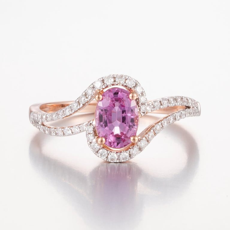 14CT ROSE GOLD PINK CEYLON SAPPHIRE AND DIAMOND DRESS RING. Featuring Centre, One Oval Cut, Fancy Deep Purple Pink Ceylon Sapphire (0.95Ct Slightly Included), Claw Set, With 54 Round Brilliant Cut Diamonds (0.27Ct Tdw, G-H Colour, Vs1-Vs2 Clarity), Pip Claw Set. Ring Size O. Valuations Provided by an Independent Third-Party Professional Not Directly Associated With Lloyds Auctions at AUD $16000This valuation has been conducted by an independent third-party professional. The valuation amount is an assessment by the issuing valuer and does not reflect the auction value of the item. Any inquiries regarding the valuation should be directed to the issuing valuer (refer to contact details on the certificate), as Lloyds Auctions has no affiliation or influence over the valuation, the valuer, or the stated amount. Condition: Good - Refer Images 0586115+1275
