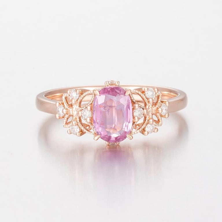 14CT ROSE GOLD PINK SAPPHIRE AND DIAMOND DRESS RING. Featuring Centre, One Oval Cut, Moderate Vivid Pink Sapphire (1.08Ct, Slightly Included), Claw Set, With 10 Round Brilliant Cut Diamonds (0.13Ct Tdw, F-G Colour, Vs1-Vs2 Clarity), Bead Set. Ring Size O. Valuations Provided by an Independent Third-Party Professional Not Directly Associated With Lloyds Auctions at AUD $14500This valuation has been conducted by an independent third-party professional. The valuation amount is an assessment by the issuing valuer and does not reflect the auction value of the item. Any inquiries regarding the valuation should be directed to the issuing valuer (refer to contact details on the certificate), as Lloyds Auctions has no affiliation or influence over the valuation, the valuer, or the stated amount. Condition: Good - Refer Images 0586115+1277